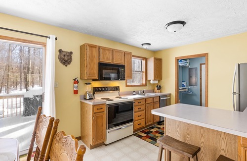 Enter into the living room with an open floorplan that extends through to the dining room and kitchen. This room comfortably seats six and features a 65" flat screen TV, and a wood burning stove. The kitchen includes a dining table that seats six and breakfast bar for two, abundant cabinet space, the refrigerator and dishwasher have recently been replaced with stainless steel appliances. There is also a Keurig K-Cup coffee maker, toaster, toaster oven and slow cooker. The primary bedroom has a queen-sized bed, front and side facing windows, ample closet space. The 2nd bedroom includes two twin-size beds, ample closet space and rear and side facing windows. The 3rd bedroom is tucked away on the opposite side of the house, with a queen size bed and a large closet. This bedroom also has an attached bathroom. The main bathroom includes a tub/shower, vanity with under cabinet storage and a wall mounted mirror with additional storage space. The 2nd bathroom includes a stall shower and vanity with under cabinet storage. The laundry room has a new washer and dryer, storage for coats, a countertop workspace and a utility sink.