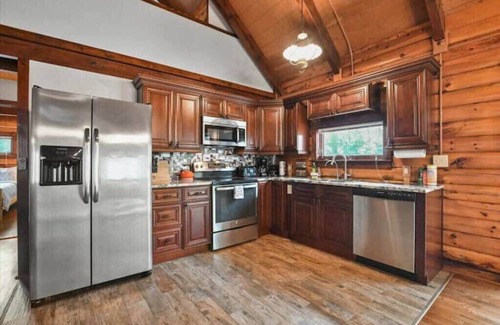 Upon entry into the cabin, you will walk into the living room and kitchen areas! Our kitchen is fully stocked with everyday essentials that you'll need to feel right at home. Our living room has a huge 65" TV for everyone to gather around and watch a movie and enjoy the Pocono Mountains!