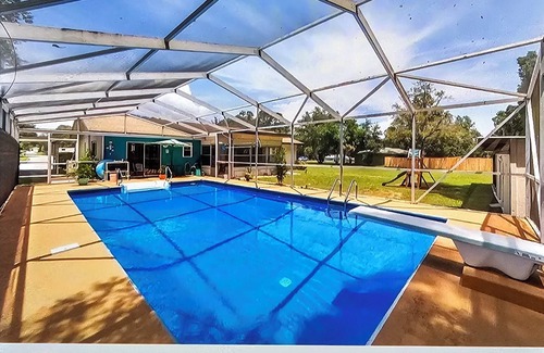 This cozy home has 2 bed/2bath, plus a sunroom, sleeps 5 guests (with Queen air mattress & leather reclining couch & chair) & relax by the nonheated pool. No pets, No smoking. Enjoy swimming, kayaking, eco-friendly adventures. Home has internet wifi, movie DVDs, board games and play music-albums on the old fashioned turn table. Enjoy Golf Course just 100 yards away & the clear water at Rainbow Springs - always 72 degrees. Rainbow Springs National Park is just 400 yards away from the house. Exterior security cameras on property