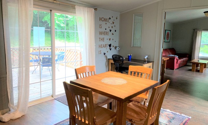 Our home is nested on top of a hill in beautiful Lemont on a private, half-acre lot located 5 minutes from Beaver Stadium. Freshly renovated mobile home that comfortably sleeps 6 people. There are 2 bedrooms, one room with a queen and another with two twin beds, there is also a sofa bed in the living room. There's a Spacious living and dining room/kitchen, also a private and cozy backyard with a gas grill and fire pit that usually get visited by a deer family. This cozy home is perfect for football weekends. Walking distance to local cafes and eateries and also close to many hiking and park and Spring creek, and a bus stop at the bottom of the road!