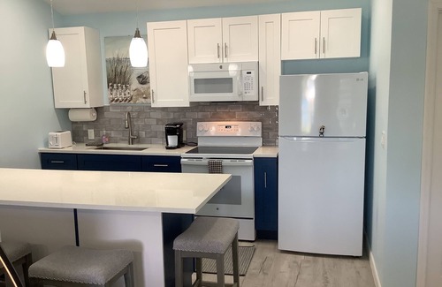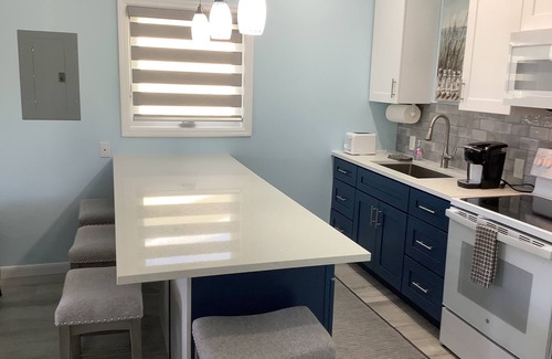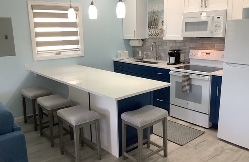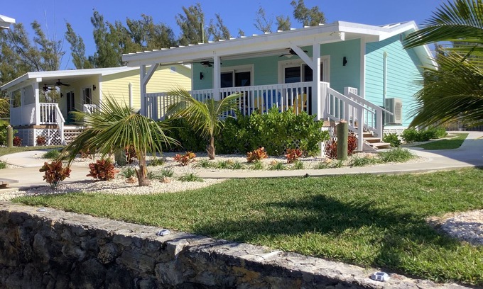 Welcome to this 1 of 3 brand new colorfully cool studio/cottages by the water in Freeport. This charming GREEN studio/cottage features a phenomenal all in one living space with a king size bed and a cozy living area were there is a comfy queen sofa sleeper that will accommodate from 1 to 4. The rate is based on up to 4 guest only. The 2 comfortable barrel chairs round out the living/leisure area. You will enjoy the relaxing view from your sleeping area as it has a full view of the beautiful blue water. The unbelievable fully equipped kitchen is made up of a full size refrigerator, full size oven range, microwave, toaster, Kerurig coffee maker and all the essentials to prepare anything from an appetizer to a gourmet meal. The center Island is for you for enjoying happy hour together, dinner sitting or just playing that fun card game. The washer and dryer are in the unit for your personal convenience along with an iron and ironing board. The no clutter walk-in closet is a perfect space for storing your luggage and your personal belongs. The bathroom is furnished with lush towels, toiletries and beach towels. Step into a spacious and luxurious walk-in shower after a day of traveling around or from spending a relaxing day at one of the many beautiful beaches. Your own private porch is your space to enjoy your morning coffee while you look out at the beautiful quiet, blue water or enjoy the amazing colorful sunsets in the evening. Sitting in the gazebo sipping your cocktail while grilling is another relaxing spot to look forward to. The selections of several amenities is another plus with your getaway stay with us such as a free 34’ floating dock with 30 amp service for your boat with water hookups on the docks, plus an outdoor shower, BBQ under the gazebo, free WI-FI, Direct TV, your own washer/dryer, Split type AC and ceiling fan for utmost and comfort cooling. For those who like the water sports, explore the canals with the furnished kayaks and paddle board or take the bikes for a ride around or to the beach. We are only a 15 minute drive from the airport and in The Bahama Reef Section and located at the end of a Cul de Sac that gives you the privacy and quietness as you enter the well lite and secure gated private parking area. This neighborhood is quite, safe with a beautiful blue canal. We are only a 15 walk to the beach or a 5 minute drive by car to the colorful Lucaya Market Place, restaurants and gift shopping. While in the area there is a golf course for all the golfers. The Sea Horse Shopping Center is where you will find a fully stocked Solomon’s Grocery Store and a Deli that offers the salad fixings or Bahamian dishes for you to takeout. Also in the shopping center is a liquor store to buy your favorite spirit or even buy a fresh pizza in the center. For all the divers, you can take the dive boat in the immediate area for an ocean dive. If you want that snorkeling trip on your own day trip, just drive to Deadman’s Reef at Paradise Island and then treat yourself to a conch salad right there. Another day trip is going to Bishop’s on the beach at High Rock and enjoy his special cracked conch. Oh So Good!! Another day you could spend at the beautiful beach at Banana Bay and walk out in the ocean at low tide followed by a super lunch on the beach. This is a must!! The National Park and the cave systems is of interest as is the Reef Growing Center. These are just a few of the attractions that you will want to do. If you are interested in how Sands Beer, the beer of Grand Bahama is brewed, there are daily tours. Interesting!! After exploring all the attractions, you will certainly look forward to returning to your own comfortable relaxing surroundings. You will have everything at your fingertips when you chose your holiday stay at this unique and perfect place for your special time right here with us. Be sure to check out all 3 colorful Blue, Green and Yellow Studio's for your special Island trip.