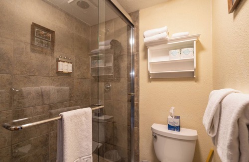 To access the Manitou Lodge, guests cross the footbridge located at the end of S. Fir Street. This room is located on the second floor and is two stories. Guests enter the room and are welcomed into a small living area with a twin sofa sleeper, mini-fridge, small vanity area and double doors that lead to a balcony overlooking the Manitou's deck and the river. The bathroom is located on this level and has a large step-in shower with a glass enclosure.