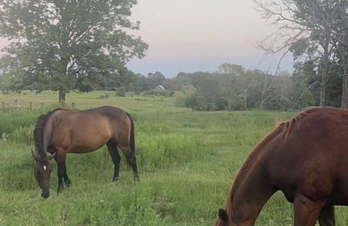 Escape to the tranquility of a 20-acre ranch, where open green pastures and a serene pond await. This listing is for a cozy private room, perfect for a solo traveler or a couple seeking a peaceful retreat. Enjoy the privacy of your large studio style room while sharing a well-kept bathroom just down the hall.