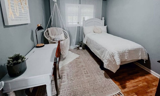 In this cute and cozy home, you have access to lots of amenities -private bedroom w/large closet, desk/vanity, hanging chair, shared kitchen, living room and bathroom. Super comfortable twin bed is waiting for you.