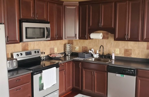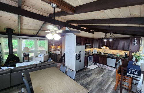 Cozy-up with your partner, family, or friends at this peaceful oasis. You'll be amazed by the clean and fully stocked home away from your home. Upon entry, a pool table awaits, with two bedrooms across the hall from each other. There is a full bathroom and kitchenette/laundry room on the entrance floor. The top floor features an executive master suite with an en suite bathroom, a pristine kitchen, dining room, and cozy living room area with a fireplace.