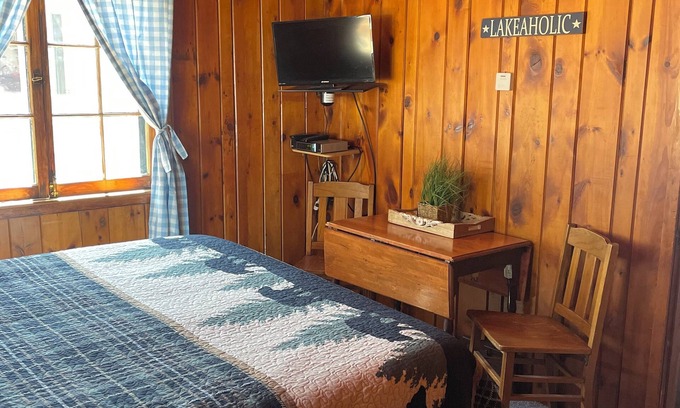 Located in Wirt, this 1-bedroom hotel room with queen bed is attached to the main resort lodge. Full bathroom with jetted tub and full shower will sure relax you. Free dock space, resort amenities, and amazing swimming beach are all included. Full bar and lodge on site. ATV trails from your doorstep. Small dining room table and mini fridge and microwave complete this cozy room. **Not Lakeside cabin** Propane firepit