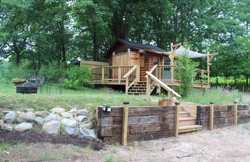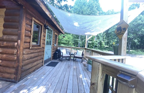 Comfortable, one of a kind, hand-built log cabin on 10 acres in the North Woods. Amenities include wrap around deck, electricity, hot water, kitchenette with cooking, refrigerator/freezer, private outdoor hot water shower, heater and Wi-Fi.. We rent a clean, private and accessible porta-pottie. There is NO indoor bathroom. The cabin is part of our family homestead, there are other occupied dwellings on the property - all have space and privacy. The cabin is directly behind the main house.
