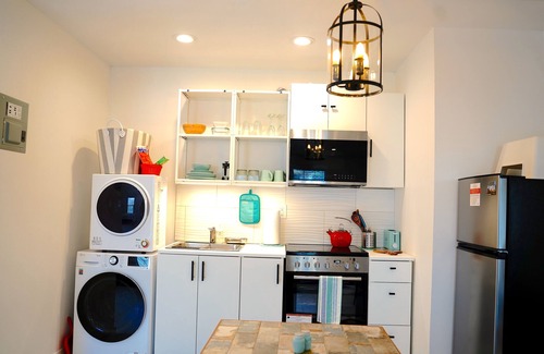 Living space has a workspace with wi-fi, a 55 Inch smart tv set with sound-bar and free Netflix. Please note there is no dishwasher at this time, but we have a big sink and a drying rack.