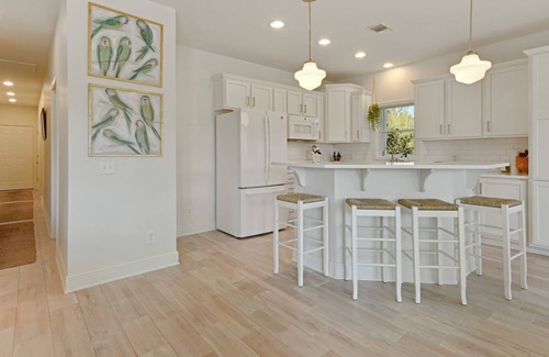 Enjoy the views from the raised back porch in this freshly updated property with bright, airy decor. Conveniently located near Henderson Point Beach, hike the enchanted nature trail nearby or set out on the pair of beach cruiser bikes provided to explore the surrounding area. Dock your boat out back to truly enjoy all that this quiet beach community has to offer. Boat dock with sink for cleaning your catch of the day. Full size laundry, lift for luggage, ample parking, and covered patio perfect for a crawfish boil.