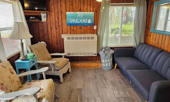 Regatta Cottage is located in Anchorage Cottages & Retreat Center on the sandy shores of the Great Lake Huron. It is 1 of 6 cottages on the property. This rustic cabin is fully furnished and has shared beachfront a few feet away from your door. Picnic tables, firepits, a charcoal grill and beach furniture help round out your quintessential Up North experience here in Oscoda.