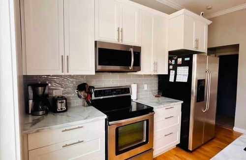 We look forward to hosting you. Your home away from home awaits. Rich hardwood floors combined with tasteful renovations brings modern essentials. Expansive 10 ft ceilings, a large fully stocked kitchen with large modern island, and warm family friendly decor.