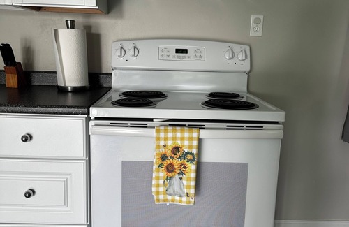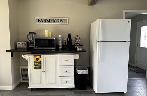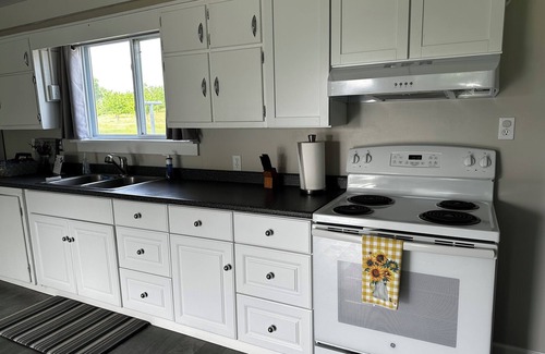 The kitchen is equipped with stove, refrigerator, microwave, Keurig coffee maker, toaster, blender, dishes, glassware, silverware, pots and pans, and the moveable kitchen island is stocked with everything you need to bake if you wish. There are two dining options, one in the house at a counter height table with seating for six and the table on the deck with seating for four. If you want to grill, there is a gas grill on the patio.