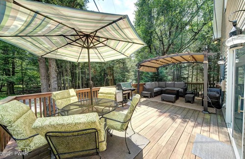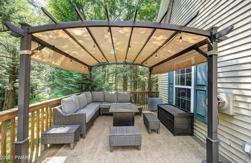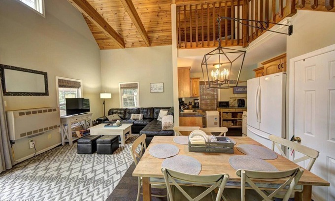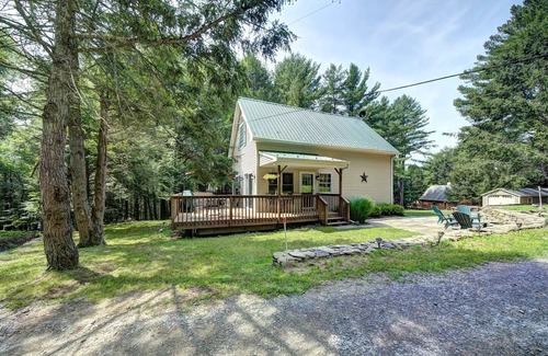 Cozy Chalet up in the trees. Access to a boat dock across the street, on the river leading onto Lake Wallenpaupack! Dock is shared with one other home. The dock is a short walk away where you can leave your boat for the time you stay at the home. Small private river community with only 5 homes for peace and quiet. Outdoor fireplace to keep you warm at night. **Please watch video to show the walk to the water. https://youtu.be/jq-FkBnAeqw