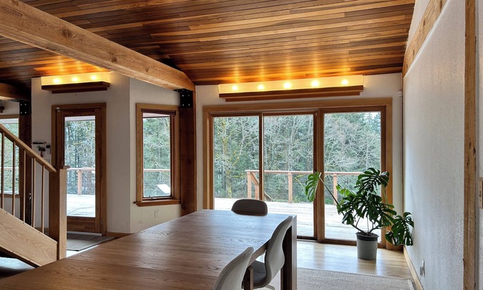 Our serene house boasts a spacious wraparound deck with panoramic views of the majestic river and lush forests. Unwind with loved ones in our airy kitchen, living, and dining spaces, offering stunning views and a selection of board games & cookbooks — perfect for sharing laughs over a glass of wine. Or, embark on countless adventures awaiting in the surrounding area!