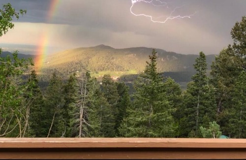 Cozy rustic mountaintop cabin (9300’ elevation) nestled in 500+ acres of woods and beautiful rocky outcroppings.