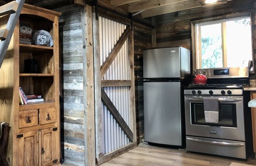 Main level is an open floor plan with full size kitchen (fridge/freezer, oven, stove, sink and cupboards) and compact living space with futon, shelving and fold up table and chairs.