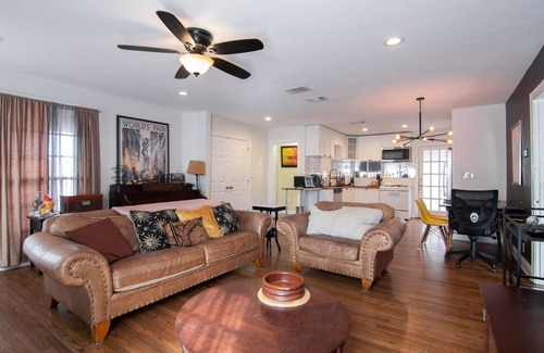 3 Bedrooms inside the home, then 10 twin beds inside a classic tour bus right outside the front door. Huge backyard with fire pit, grill, picnic tables, and covered side patio. Kitchen with everything you need to cook a great home cooked meal. Not to mention you can scooter right into the heart of downtown within minutes. It doesn't get better than this.