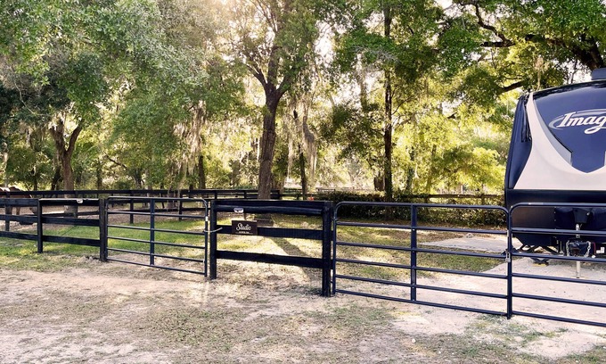 Ocala is waiting for you at this 1-bedroom travel trailer. Bring young kiddos and a dog to relax in our cozy travel trailer, situated on a 3-acre horse farm in Ocala. Enjoy quiet evenings in a fully fenced, park-like yard after days spent exploring the area's horse culture, woods, and natural springs.