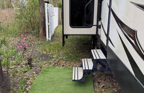 This listing is perfect for people who work a lot and need a nice place with all the essentials to call home. It is a very large RV with The entire wall of the living area tinted windows which allow you to view the tree line in daylight and the white partial fence with a soft touch of solar lights at night.