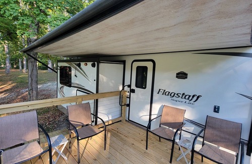 This spacious camper has a 1-bedroom with queen bed. The cozy space is equipped with all the essentials you need for a comfortable stay, including a hair dryer, heating, and AC. Step inside and be greeted by a soothing atmosphere that will make you feel right at home. Fall in love with Leavenworth and enjoy the magic it has to offer. Located on Little Blue River and the mouth of the Ohio River. Enjoy relaxing on the deck or by the firepit. Private boat dock is perfect for fishing, watching all the water activities, kayaking, or for your own boat. Two kayaks available while you stay. Looking for more? Play a game of "Washers" a "Locals" favorite past time. Or, enjoy a movie on the outdoor movie screen.