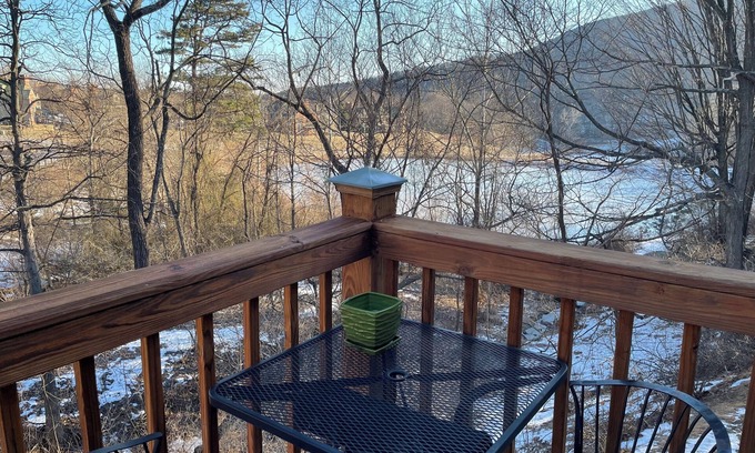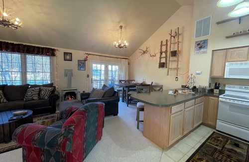 Comfortable ski chalet, end unit, just a few minutes walk to the lift. You will be greeted by fun seasonal decor and cozy lodgings with plenty of accommodations for all. There is a dining area, open concept kitchen, vaulted ceilings, wifi, gas iron stove fireplace, rear deck overlooking the pond and mountain, dedicated parking, washer/dryer, and much more!