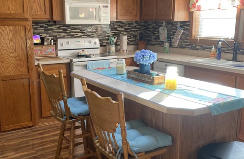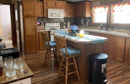Open floor plan with lots of space! Big kitchen with all amenities needed. Enjoy the huge back porch and watch the wildlife war from the orchard off the porch. Leave the rat race of the city and enjoy the peace in our remote home