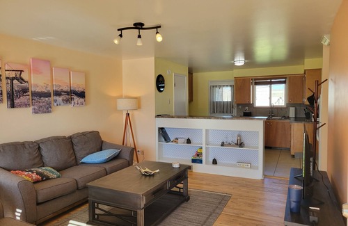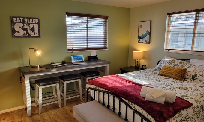Newly added dedicated work space for telecommuters. A 3 person console table with bar stools, power and USB outlets, desk lamp and writing pads. Work from "home" while you visit gorgeous Salt Lake Valley.