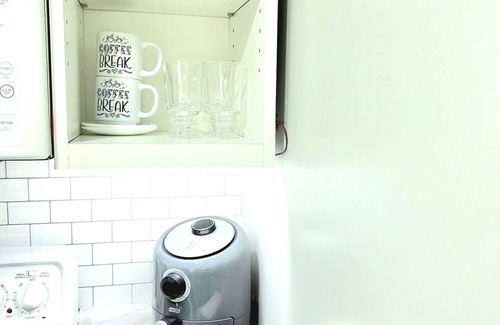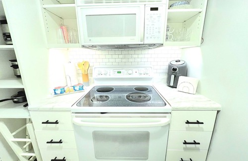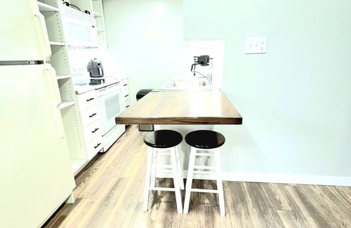 -Bathroom (shower) -Living room with Smart TV and futon -Full kitchen -Work desk with iMac -Queen bed (we have a single mattress available) and futon -Private laundry room. -Wi-Fi.