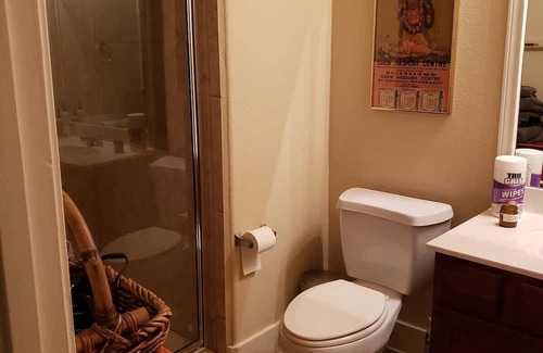 This adult only home is perfect for relaxation, work, or study for professionals. The upstairs bedroom features a cozy queen bed, TV, and plenty of space to store your belongings. The shared bathroom includes a refreshing shower and fully stocked for your convenience. With amenities like AC, WiFi, washing machine and dryer and easy access to the greater Austin community attractions and events, your stay will be delightful. During your stay, take advantage of the fitness area to keep up with your workout routine or ask about access to the nearby community center that includes a workout area and pool. Enjoy access to scenic walking trails, restaurants, and shopping. If there is anything you need during your stay, please feel free to ask.