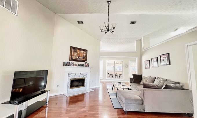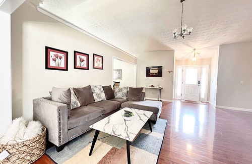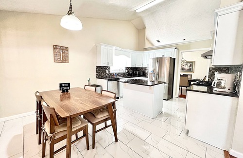 This beautiful home has plenty of space for rest, entertainment, and memories. The master bedroom features a king size good quality mattress to ensure a good night sleep and master bathroom. The second and third guest rooms are a little cozier and each has a queen size bed. The bonus bedroom also has a king size bed and another bathroom with modern shower. We also have a queen self-inflating air mattress available upon request. The newly renovated kitchen is fully stocked with stainless steel appliances and all the kitchenware you might need for your stay. The cozy living room features a comfortable sectional ready for you to hang out and lounge. For your entertainment, the house includes a smart tv with free Netflix/Roku along with basic local channels and high speed internet. This home is newly renovated and very well kept, professionally cleaned and sanitized after each and every use.