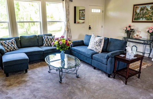 Upon check-in, guests will discover elegant decor and ample natural light in the living room. This main living area is the perfect place to unwind on the comfy upholstered sofas and stream your favorite show from the smart TV. You can also host a game night using our provided board games!