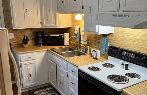 It was just remodeled with brand new paint throughout, a new central heating and air HVAC unit, new bedding, new flooring, and sofa in the living room. This rental includes a complete kitchen with all of the necessities, from pots and pans down to silverware, and a full-size stove & refrigerator, and charcoal grill for your use on your private, covered, back patio! We have supplied everything down to the hangers to hang your clothes on inside of the full-sized closet with dressers in the bedroom. There is a TV in the living room and one of the bedrooms, with a DVD player at each TV to watch your favorite Red Box movies on.