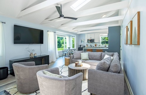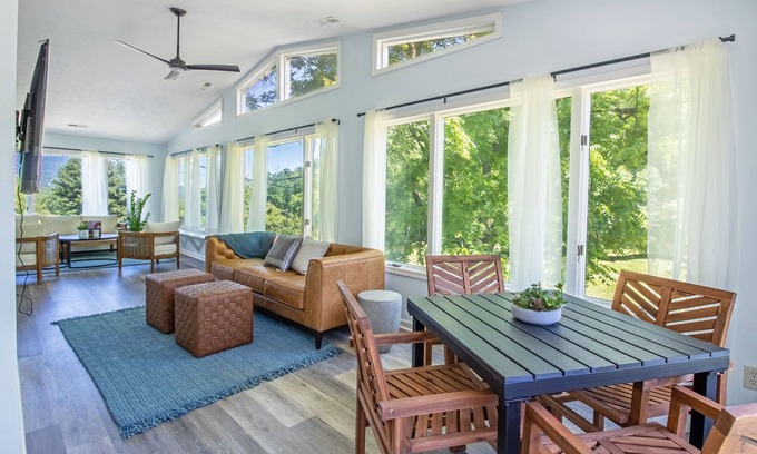 The home’s newly renovated interior showcases country living at its finest. The exposed beams of the living area accentuate the vaulted ceilings and provide a cozy atmosphere to gather with friends or family. Bask in the natural light of the sunroom that offers glimpses of the surrounding mountains or prepare a hearty feast in the fully equipped kitchen. No matter where you choose to spend your time, Midnight Rose guarantees comfort and convenience.