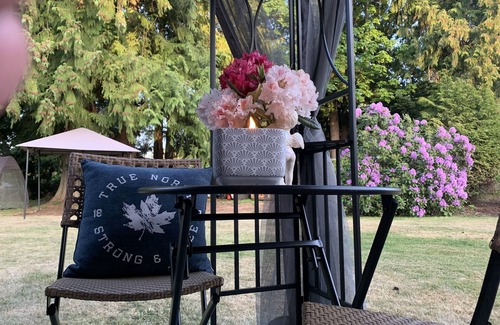 Welcome to Angels Inn Studio apartment. A fully self contained studio apartment with all newly constructed furniture and appliances. Including washer and dryer, dish washer, full fridge and two hot plates for cooking. Rice cooker, air fryer and microwave are also included for cooking. Coffee brewing is available with coffee pot and kettle. This unit has a beautiful queen bed with a view of gardens. There is a daybed that can sleep an additional individual if needed. This unit is meant to sleep three max comfortably. This studio apartment is located on one acre of property at the back of the owner's home. The owner is presently living here on site. The gardens are for you to wonder and admire. There is a sitting area located under the trees at end of driveway. There you will find picnic tables and chairs and a swing for the little ones. There is a covered patio area located just outside your unit and an additional sitting area in the back yard. There is a propane BBQ for your convenience as well. You are located in a very nice residential area located two blocks just off the Island highway. The beach is literally five minutes away from the house. The owners will be more than happy to welcome you and give you a tour if you want. Just ask by knocking, texting or calling is on arrival.