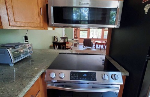Escape to our serene 500 sq ft second-floor studio, perfect for nature lovers, writers, and artists. Enjoy a private deck overlooking 28 park-like acres with over a mile of walking trails, plus access to 14,000 acres of adjacent timberland. This well-equipped retreat features a full kitchen with granite counters, a cedar closet, and a cozy living space, ideal for extended stays.