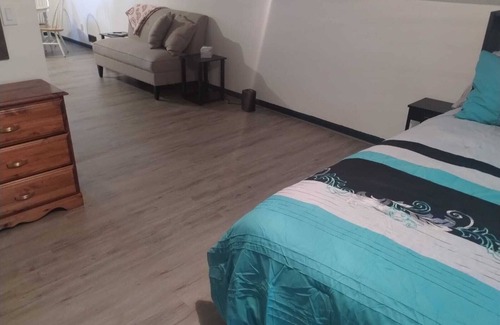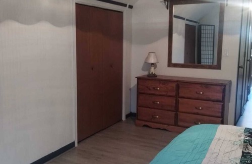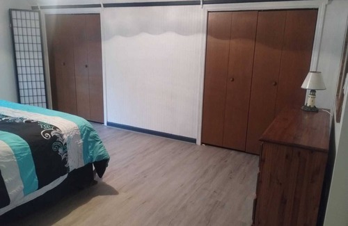 We live in the downstairs but the upstairs is all yours, with keypad access at the private outside entrance. You'll be sleeping in a comfortable California King bed with a hybrid mattress.