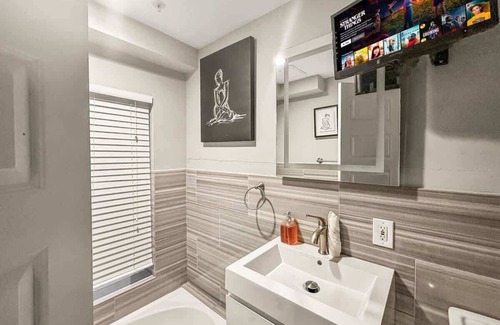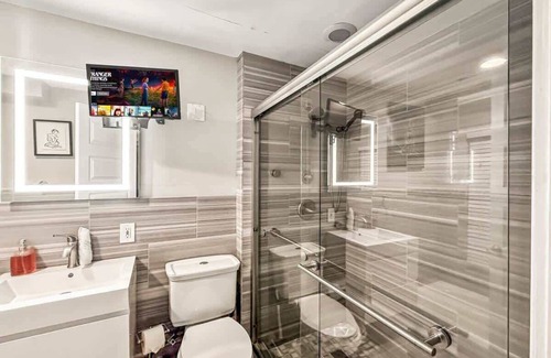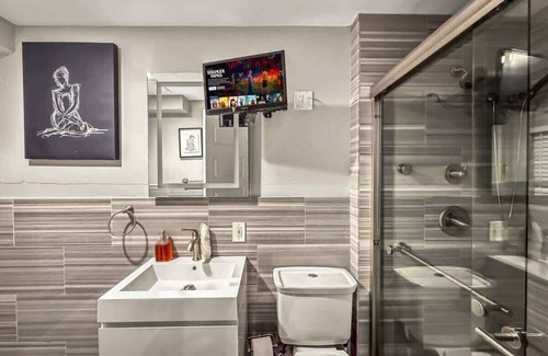 Bathroom: Freshen up in the modern bathroom featuring a walk-in shower, plush towels, and complimentary toiletries. Everything you need to pamper yourself after a day of urban adventures.