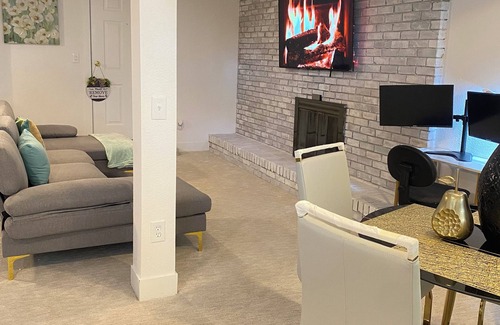 Consider this superb newly remodeled studio gem your apartment away from home while you visit Elko. This terrific space offers a cozy King size bedroom, complete with all the essentials like iron, hair dryer, living room, computer desk, dinning table, fridge, microwave, keuriq coffee maker, smart TV and WiFi. With a cozy King size bed and a clean stylish bathroom, this gorgeous retreat is perfect for solo guests or couples looking for a peaceful stay. Enjoy delicious American cuisine, Italian cuisine and sushi restaurants less than 0.5 miles from this studio. Also, it is kitty corner to CVS. The airport is less than 0.6 miles away for your travel convenience.