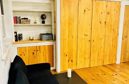 Escape to this charming studio in the quaint town of Poultney, Vermont. Whether you're looking for a peaceful spot to focus on remote work or a place to recharge and enjoy nature, this cozy studio is the perfect fit. The space features all the modern conveniences to make your stay comfortable, including high-speed WiFi to keep you connected, a stereo system to set the perfect ambiance, and a stylish tile shower for a refreshing start to your day. The Murphy bed folds seamlessly into the wall, giving you extra space to relax or work during the day, and the rustic hardwood floors add to the warm and inviting atmosphere.