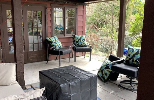 The covered outdoor patio is private and has cozy outdoor furnishings along with a patio table and a BBQ.