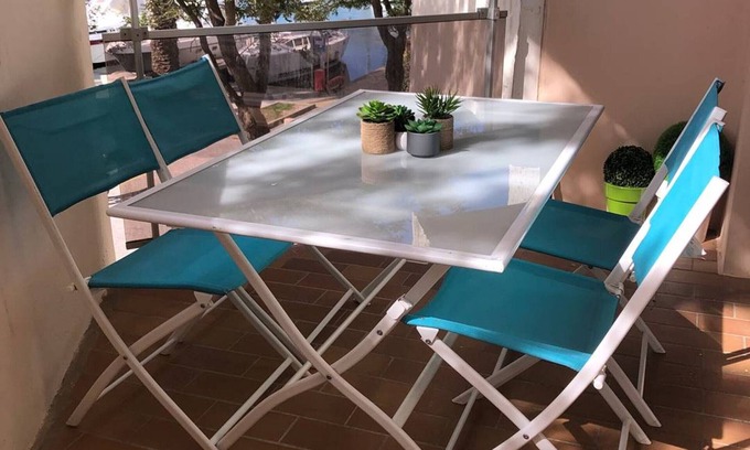 Appartement de type studio d’environ 22 m², situé au 1er étage. Aménagement : cuisine ouverte et équipée avec four, plaques de cuisson, hotte aspirante, frigo/congélateur, micro-ondes, lave-vaisselle et nécessaire vaisselle. Espace séjour avec canapé convertible et TV. Une salle d’eau avec baignoire et lave-linge. WC séparés. Une cabine avec lits gigognes. Un balcon équipé pour les repas au soleil. Exposé Ouest. Équipé pour 4 personnes (idéal 2 adultes/2 enfants). Petits animaux acceptés. Linge de maison et draps non fournis. Le ménage n'est pas inclus.