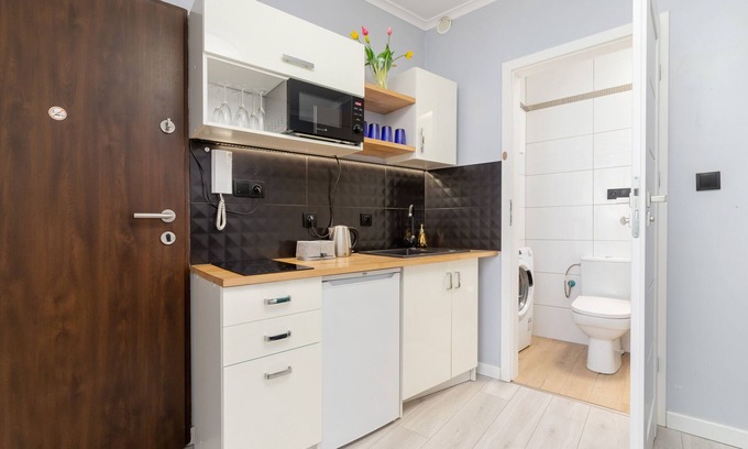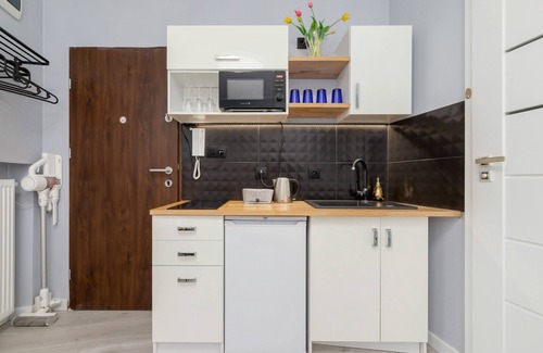The studio apartment is located on the ground floor of the building on Radomska Street in Krakow - one of the most beautiful Polish cities! Location of the building in Krakow's Olsza district provides comfortable accommodation at a distance of about 2.5 km from the Old Town. Thanks to this, the area around the apartment offers silence and respite from the hustle and bustle of the city center. Just 650 meters from the apartment is the bus stop "UR Al. 29 Listopada", from which numerous bus lines depart, through which you can get to the city center within 15 minutes. Thanks to the well-developed public transport, it is easy to get to well-known attractions and monuments that are the most important points on the map of Cracow. Such places as the Wawel Royal Castle and St. Mary's Basilica are historical gems of Polish architecture. The property's location, well connected to other districts, makes it possible for guests to fully enjoy the charms of the city. The Krakow Central Railway Station is less than 10 minutes by car from the apartment, and the drive to the John Paul II International Airport takes about 30 minutes by car or cab.