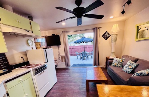 Adorable 1 bedroom suite with outdoor private patio and access to private pool during warm months. Fresh linens, full kitchen and wifi welcome you to this oasis just minutes from fun in every direction