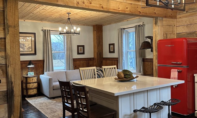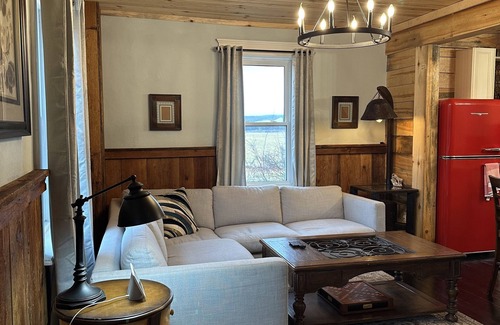 The farm house kitchen features a beautiful red 1950s style fridge, and antique farmhouse stove, quartz counter tops and a large island with barstools. There is lots of space for everyone whether you are enjoying a delicious meal or playing board games. The kitchen comes fully loaded with, pots, pans, kettle, coffee maker, toaster, glassware, cutlery, and place settings. and The main living room is open to the kitchen and has a large sectional couch, electric fire place and large TV. The second living room has a lazy boy couch, chair, a work station and a TV.m