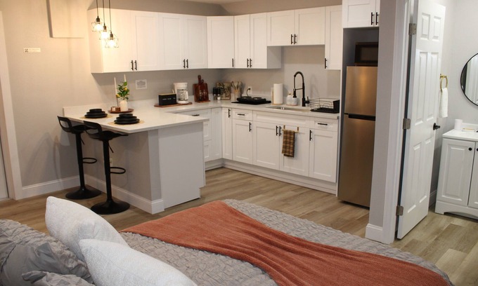 The entire space is designed to provide total privacy, spotless cleanliness, and a genuine sense of home during your stay. Guests have 100% private access to the studio via a separate side entrance with a keyless lock via code, allowing you to come and go freely and securely. You will not share any space with other guests or the host, the entire studio is exclusively yours. In addition to the private patio, you'll have access to one parking space in the driveway located on the right side.