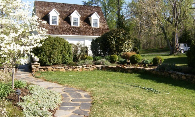This Pantops private suite is located on historic land, next to Old Ordinary, one of the oldest homes in Charlottesville - just 10 minutes from downtown and short drive to wineries. The apartment has two queen bedrooms, 1 bathroom with a jetted tub, full kitchen, dining area for 6 people and a cozy living area with a work desk. Views overlook beautifully landscaped gardens and seven acres of land. This property which started as a Tavern in the 1700's now serves as an extended stay space (>30 nights). Enjoy the TV and high speed internet. There is a nearby basketball net for shooting hoops or you can just enjoy the views from the porch or patio.