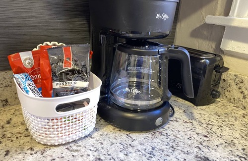 • Full kitchen with Drip coffee maker, microwave, electric range, dishwasher & refrigerator - Pots, Pans + Bakeware