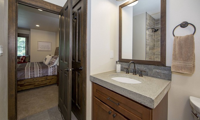 Layout - The main floor master suite offers a king sized bed, TV, and the master bath has a huge shower, soaking tub, and dual sinks. The main level also offers a guest suite with a king size bed. Upstairs offers a 3rd bedroom with on suite bathroom and window seat for nature watching or reading. Down the hall is the 4th bedroom with a king size bed, a window seat for some down time, and a semi private bath offering double vanities and shower with a tub.