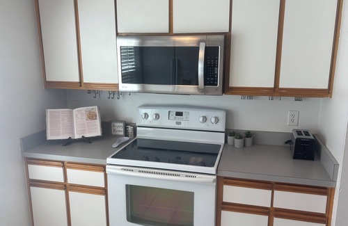 The fully stocked kitchen includes pots, pans, a coffee maker, toaster, microwave, utensils, wine glasses, a dishwasher, and a full-sized refrigerator—everything you need to feel at home and prepare your favorite meals.