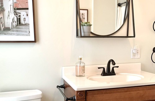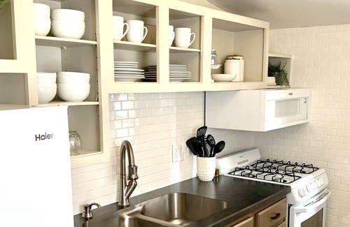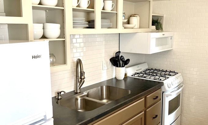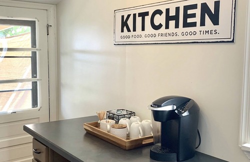 On the first floor you will find a living room with a comfy sofa and chairs and also a dining table that seats four. There is a smart TV in this room that is loaded with many of the popular apps, but no cable TV. On your way to the kitchen is the full bath. (there is an extra 1/2 bathroom in the basement.) The kitchen is fully equipped with everything you need to cook up a quick meal. There is a sit up bar for two were you can sit and sip your coffee from the Keurig coffee machine.